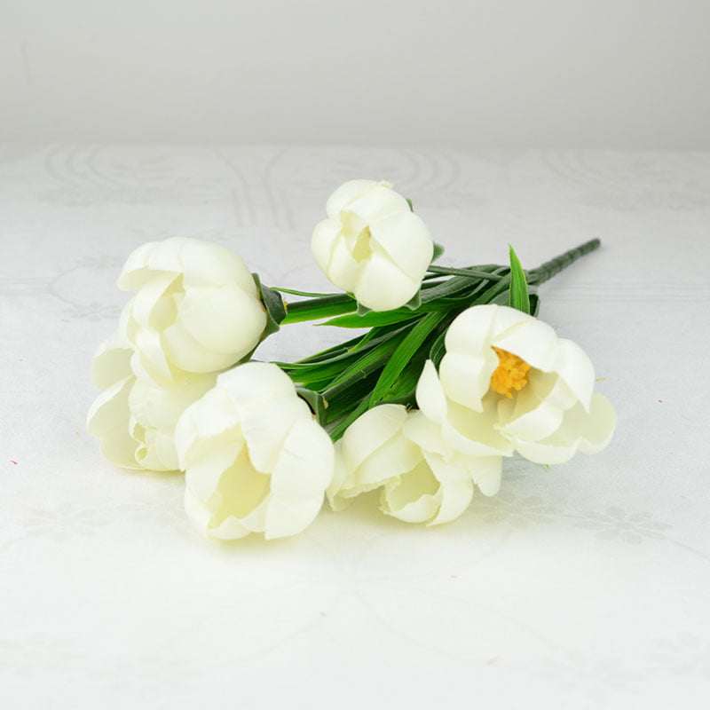 32 cm magas, 6 virágos krókusz csokor. A virágfejek mérete 3×5 cm. A csokrot hosszúkás levelek díszítik.