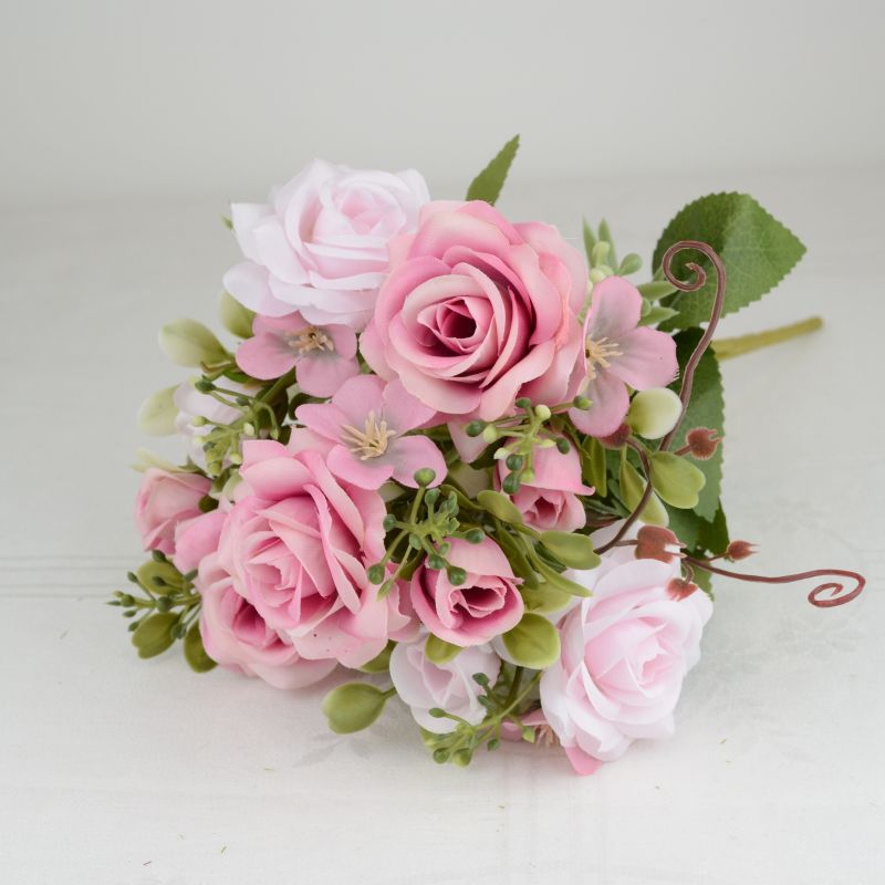32 cm magas, 5 ágú mini rózsa csokor. Minden ágon található egy nyílott és egy bimbós virág. A csokrot levelek, díszítők dúsítják.