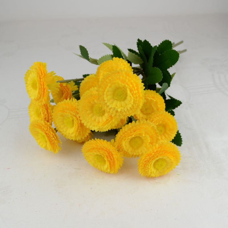 9 szálas százszorszép köteg. Egy ág egy 4 cm és egy 3 cm átmérőjű virágot tartalmaz. A köteg könnyen szétszedhető szálakra.